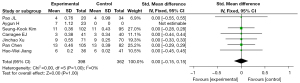 Rev Man 5.4 software was used for data consolidation and statistical analysis. For binary data, relative risk ratio (RR) and 95% confidence interval (CI) were used to represent the data. For continuous data, mean difference (MD) and 95% CI were used. When I2 was >50% and P was <0.1, we adopted a random-effects model, and when P was >0.1 and I2 was <50%, we adopted a fixed-effect model. If it is caused by clinical factors or research methods, the t-test of two independent samples is used to compare the difference between the random effects model and the fixed effects model in the point estimation and interval estimation of the combination values, and to analyze the sensitivity. Heterogeneity may come from population, test method, race and other factors.
