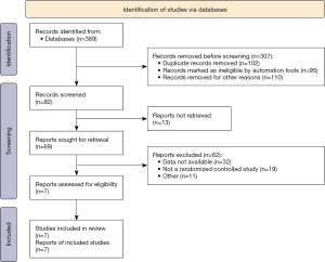 Based on the search strategy, 389 relevant articles were retrieved, of which, 296 duplicate articles from the databases were excluded. A full-text screening was then performed, and after the application of the inclusion and exclusion criteria, 7 articles remained and were included in the systematic evaluation. The literature screening process and results are shown in Figure 1.