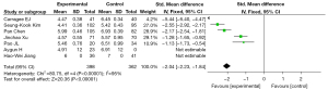 In relation to the results for the length of hospital stay, there was statistical heterogeneity between the 2 groups (I2=95%, P<0.0001); Therefore, the random effects model is used. The results of meta-analysis showed that the length of hospital stay in UBE patients was significantly shorter than that in the control group (MD =−2.04; 95% CI: −2.23 to −1.84; P<0.05) (Figure 2).