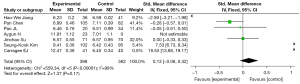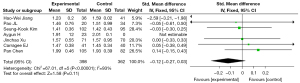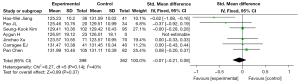 We analyzed the intraoperative bleeding indicators and found them to be heterogeneous (I2=40%, P=0.14). Therefore, a random effects model was used. The results of the meta-analysis showed that the UBE group had less intraoperative bleeding than the control group, but the difference between the 2 groups was not statistically significant (MD =−0.07; 95% CI: −0.21 to 0.08; P=0.37) (Figure 4).