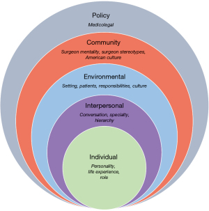In this context, we sought to review the existing literature regarding the known and suspected factors contributing to moral distress among surgeons. Our objective was to synthesize current literature and provide a thematic summary of these factors based on the social ecological model (SEM), which facilitates the conceptualization of health broadly. Here, a summative understanding of the complex interplay of factors at the SEM levels (e.g., individual, interpersonal, environmental, community, and policy) help facilitate a detailed investigation into this critical problem and may potentially facilitate targeted interventions that protect surgeons from psychological harm and promote better patient outcomes. We present the following article in accordance with the PRISMA-ScR reporting checklist (available at https://apm.amegroups.com/article/view/10.21037/apm-22-916/rc).