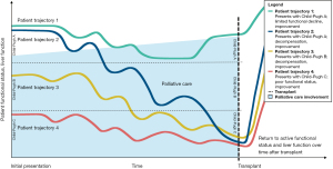 Figure 3 Patients with HCC eligible for transplant: escalation of palliative care with decline in functional status, liver function; concurrent with disease-focused treatment and transplant. Examples of potential courses of patients presenting with HCC and varying Child-Pugh scores for cirrhosis, eligible for transplant. Decline of functional status and liver function may be attributed to side effects of treatment or natural history of liver decompensation over time. Palliative care involvement increases from time of presentation and may vary given unpredictable clinical course with fluctuations in decompensation and recovery through time of transplant. Palliative care role will also vary according to patient and caregiver psychosocial and spiritual needs, severity of cirrhosis, decompensation, and HCC stage. Patients may subsequently return to an active functional status in a curative pathway. HCC, hepatocellular carcinoma.