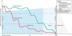 Figure 4 Patients with HCC not eligible for transplant: increasing involvement of palliative care and hospice as patient functional status declines. Examples of potential courses of patients presenting with HCC, not eligible for transplant, experiencing decline over time in functional status and liver function, ultimately leading to decompensation and death. Palliative care involvement may vary given unpredictable clinical course with fluctuations in decompensation and recovery from initial presentation while receiving concurrent disease-focused care for HCC. Involvement of hospice care prior to death. Bereavement follow-up. HCC, hepatocellular carcinoma.