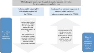 This review underscores several methodological factors linked to the selection and measurement of PROMs which could impact the (cost-)effectiveness assessment of a PC intervention. Certain factors could notably reduce the impact of a PC intervention on PROM outcomes while others may affect it to an unknown extent (Figure 1).