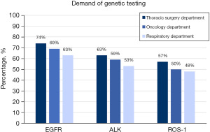 Among the demands which clinical pathologists received, the EGFR testing was the most frequent testing regardless if it was from the thoracic surgery department (74%), oncology department (69%) or respiratory department (63%), followed by ALK testing (63% vs. 59% vs. 53%) and ROS-1 testing (57% vs. 50% vs. 48%) (Figure 1).