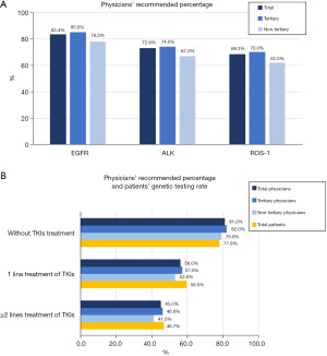 For newly diagnosed NSCLC patients, EGFR mutation, ALK and ROS-1 rearrangement, testing was recommended by 83.4%, 72.9% and 68.3% of physicians, respectively (Figure 2A). For patients who had not received any TKI therapy, who had received one line, and who had received ≥2 lines of TKI therapy, the recommended percentage of genomic testing by physicians declined gradually, being 81.0%, 56.0% and 45.0%, respectively (Figure 2B). The recommended percentage of physicians, the percentage of patients’ genomic testing were all higher in tertiary hospitals (Figure 2B).