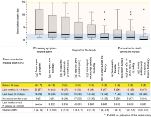 This study revealed that palpation of the radial artery is the first action taken when death is suspected, compared to other nursing interventions. Discontinuing medication, the second-highest documentation within 2 weeks before death found in this study, could be part of the care tailored to the rapidly deteriorating condition of terminal cancer patients. This result agrees with Chen’s analysis that dysphagia was a significant predictor of survival for <2 weeks (13). Inquiring about the family or supporters’ awareness of the patient’s death was an important form of support for the families of cancer patients who were nearing the end of life. Additionally, close coordination with team members regarding the patient’s worsening condition could lead to a shared understanding of death within days or hours among all involved (21).