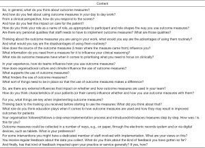 We collected data at different stages of a stepwise implementation process, which may have influenced the findings. Outcome measures were introduced step by step in the participating organisations, and this may have led to a more protracted adoption process or implementation fatigue; influencing professional views. However, we believe our data presents a pragmatic picture of the implementation process, which can be useful to services intending to implement PCOMs.