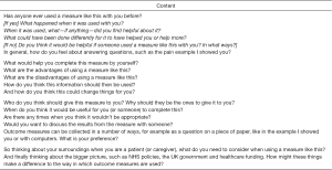 “Well if the outcome measures are too prescriptive then people will start only asking about those questions. So if there’s a symptom that’s not on the list and people get too blinkered with the outcome measures, they will stop asking about other things. Or if outcome measures become the only thing that’s important, then the more holistic nature may be lost.” (07003, palliative care doctor).