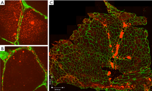 Further studies are needed to identify the specific physiological mechanisms that result in reduced muscle radiation attenuation, as this has been only recently described and the biological findings are sparse. Low radiation attenuation is associated with accumulation of lipid (37) and the term myosteatosis is often used to describe it (25,26). In patients with cancer cachexia, rectus abdominis muscle evaluated by transmission electron microscopy showed increased number and size of intra-myocellular lipid droplets compared with non-weight losing controls (38). Preliminary results from our research group also suggest high levels of intra-myocellular lipid in muscles of patients with cancer, revealed by staining rectus abdominis muscle biopsy with Oil Red O (Figure 3A,B), used in the morphological examination of neutral lipids (i.e., triglyceride). As well, large aggregates of adipocytes are evident in regions of the perivascular connective tissue (Figure 3C).