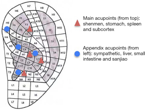 In the treatment group, patients received auricular acupuncture in outpatient clinic. We would offer patients with usual nutritional supportive care such as oral nutrient, according to the China Anti-Cancer Association’s (CACA) Cancer Anorexia Diagnose and Treatment Guidelines, if they need. Main ear-acupoints included shenmen, stomach, spleen and subcortex. Other appendix acupoints were sympathetic, liver, small intestine and sanjiao (Figure 1). The treating physician taped intradermal needles onto acupoints on one ear and pressed each point for about 2 minutes. Patients were instructed to press the needles two or three times per day by themselves. After 2 or 3 days, the physician removed and discarded the used needles and placed new needles onto the other ear. The treatment lasted for 4 weeks and we observed patients for another 4 weeks to assess the long-term durability of effects. Patients in the control group received usual nutritional supportive care and had the option to receive auricular acupuncture treatment after completing the 8-week observation period.