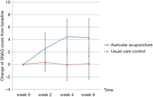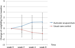 By week 8 from random assignment (the fourth week after the intervention ended) patients in the acupuncture group still reported better appetite than the control group (change of SNAQ score from baseline 4.3±3.0 vs. 0.11±2.47; P<0.001; Table 2). Compared with baseline, participants in the auricular acupuncture group gained on average 1.2 kg of weight at week 8, but those in the control group lost 0.9 kg (P<0.001, Figure 4).
