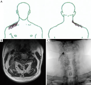We conducted diagnostic fluoroscopy-guided right C4 selective nerve root block with 0.5 mL of 1% lidocaine, and the patient showed a positive response with complete transient pain resolution. Therefore, it was confirmed that the patient’s pain was the result of right C4 radiculopathy due to right C3–4 foraminal stenosis. To treat C4 radicular pain, we performed selective nerve root injection (SNRI) with 4 mg of dexamethasone mixed with 0.25 mL of 0.125% bupivacaine and 1.25 mL of normal saline at the right C4 nerve root (Figure 1C). Thirty minutes after SNRI, the patient’s pain in the right upper trapezius muscle area had completely resolved. At the 1- and 3-month follow-ups, the patient reported no pain.