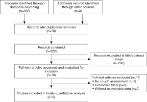 To increase the sensitivity of the search strategy, we combined the terms “azithromycin” with “cough” as key words or Medical Subject Headings (MeSH) terms. Four databases, including PubMed, EMBASE, Cochrane, and Web of Science, were searched from electronic databases inception to October, 1st, 2019. We systematically screened abstracts and full text articles for studies that met our eligibility criteria. The process was performed by two researchers (J Zhou and F Yi) independently.
