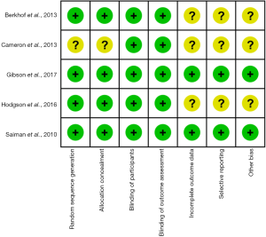 - Higgins JP, Altman DG, Gotzsche PC, et al. The Cochrane Collaboration's tool for assessing risk of bias in randomised trials. BMJ 2011;343:d5928. [Crossref] [PubMed]