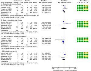 There were four trials report the adverse events during azithromycin intervention (15,22-24). A pooled analysis applied in a random effect model revealed that there was no significant difference in upper respiratory (n=808, RR 1.11; 95% CI: 0.68–1.79; P=0.68), gastrointestinal (n=808, RR 0.95; 95% CI: 0.26–3.50; P=0.94) and other adverse events (n=808, RR 0.91; 95% CI: 0.49–1.70; P=0.77) between the two groups. However, pooled data showed that azithromycin intervention had less central nervous system than the placebo in a fixed effect model (heterogeneity I2=7%, P=0.03) (Figure 4).