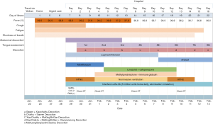 The coronavirus disease 2019 (COVID-19) is not only fast but also lethal, and has become a global pandemic, killing hundreds of thousands of people. The main clinical symptoms were fever, dry cough and fatigue, and severe cases were complicated with acute respiratory distress syndrome. Generally, COVID-19 is an acutely resolving but potentially fatal disease with a case fatality rate of 3.4%. Due to extensive alveolar damage and progressive respiratory failure, severe onset can lead to death (1,2). As of February 29, 2020, there were 79,394 confirmed cases, and more than 2,838 deaths reported. The clinical courses and clinical outcomes were assessed in 52 of 710 laboratory-confirmed COVID-19 cases with a critical illness. The median age of the patients was 47 years; 41.9% of the patients were female. Only 1.9% of the patients had a history of direct contact with wildlife. Among nonresidents of Wuhan, 72.3% had contact with residents of Wuhan, including 31.3% who had visited the city. The median incubation period was 4 days (interquartile range, 2 to 7 days). On admission, ground-glass opacity was the most common radiologic finding on chest computed tomography (CT) (56.4%). Thirty-five (67%) patients had acute respiratory distress syndrome (ARDS), and 37 (71%) patients required mechanical ventilation. A total of 32 (61.5%) patients died at 28 days, and the median time from the intensive care unit (ICU) admission to death was 7 days for non-survivors (3). As of February 18, 2020, there were 1,331 confirmed cases in the Guangdong province. Among these 1,331 cases, 1,245 cases were treated by traditional Chinese medicine (TCM), with a participation rate of 93.54%. Among these 1,245 cases, 913 cases were treated by TCM decoction alone, 177 cases were treated by TCM alone, and 155 cases were treated by TCM decoction in combination with TCM. Among the confirmed cases, 448 cases were cured, and 660 cases improved. (http://gdio.southcn.com/g/2020-02/19/content_190375424.htm) COVID-19 belongs to the category of “plague” in traditional Chinese medicine, which can be named “lung plague”. Traditional Chinese medicine treatment has the advantages of emergency, practicality and effectiveness. For different stages and types of disease, it can improve symptoms and imaging in a short time, shorten the course of treatment and reduce the occurrence of severe diseases. However, no case treated by Chinese medicine has been reported so far due to barely accessible information acquired from a skilled practitioner. In this study, we investigated the characteristics of tongue diagnosis in a patient who survived a severe ARDS with COVID-19 by treatment with Chinese medicine in combination with western medicine. The patient belongs to the type of phlegm-heat obstructing the lung and the combination of toxin and blood stasis. The results of this study will contribute to the understanding of COVID-19 and clinical prevention and treatment strategies. Because COVID-19 is a little-known disease, we want to know it in different ways. Tongue diagnosis is a traditional diagnostic method of traditional Chinese medicine, which is simple, practical, non-invasive and rapid. We hope that through such a typical case, it can be used as a reference for the diagnosis and treatment of this kind of disease.