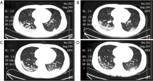 A 41-year-old man was admitted to a fever clinic on January 27, 2020, with symptoms of fever, chills, cough, fatigue, and shortness of breath. On January 22, 2020, he traveled from Henan to Guangzhou via Wuhan by a high-speed train and then to Xinyi by a bus. January 23, 2020, was the first day of his onset, with initial symptoms of mild chills and dry cough, but he did not visit a doctor but stayed at home until January 27, 2020 (Figure 1). The CT image of this man four times is shown in Figure 2. He presented to an urgent care clinic in Xinyi County, Maoming, with a 5-day history of cough and subjective fever. Chest computer tomography (CT) showed multiple patchy shadows in both lungs, consistent with COVID-19 changes in the right upper and lower lungs and the left lower lung (Figure 2A), and a throat swab sample was obtained. On January 29, 2020 (day 7 of illness), the Maoming Centers for Disease Control (CDC) confirmed that the patient had COVID-19 by reverse real-time PCR assay. Written informed consent was obtained from the patient for publication of this Case report and any accompanying images. All procedures performed in studies involving human participants were in accordance with the ethical standards of the institutional and/or national research committee(s) and with the Helsinki Declaration (as revised in 2013).
