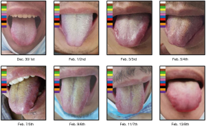 In long-term clinical practice, a set of unique diagnosis and treatment system has been formed according to TCM theory. The core of TCM diagnosis is “syndrome differentiation and treatment based on looking, listening, asking, and feeling the pulse.” Looking ranks first among the four diagnosis methods, and tongue diagnosis is an important procedure of it. Tongue diagnosis is one of the special diagnostic methods used in Chinese medicine. The appearance of the tongue is an important index to evaluate the physiological and pathological changes of viscera (5), and all the information of the tongue is obtained by doctors’ naked eyes. The diagnosis depends heavily on personal clinical experience, and different TCM experts will infer different conclusions. Some studies have shown that tongue diagnosis is crucial to clinical prognosis and treatment (6-8). The tongue is connected to the viscera through meridians. Therefore, the viscera, qi, blood, and fluid conditions, as well as the disease degree and disease progression, can be seen from the tongue. Tongue diagnosis, including shape, color, fur color, fur thickness, and other characteristics (9), reveals the conditions of organs, nature of diseases, and changes in pathogens. For example, the red tongue is closely related to the fire-heat and the yin deficiency, while the pale white tongue is related to the phlegm-dampness. According to the TCM theory, the red tongue is intricately linked to the heat pattern, with corresponding spiking fever. Thin fur is associated with the Wind and fire-heat pattern, while thick fur is usually linked to the phlegm-dampness and blood stasis patterns (5). COVID-19 belongs to the “plague” in the field of TCM. Plague attaches immense importance to tongue inspection and pulse detection. Changes in the tongue image can guide the progress of the disease. After admission, the tongue became dark red and dry, and the tongue coating turned yellow and thick. At the same time, the tongue picture changed, the condition became worse, and the patient needed to be transferred to ICU monitoring and treatment. The patient’s tongue turned dark red, which indicated that the circulation of the tip of the tongue and the peripheral circulation became reduced, the blood flow rate slowed down, and the metabolism slowed down. Therefore, the ability of hemoglobin to carry oxygen decreased, and the elimination of toxins slowed down, so the patient had difficulty breathing.