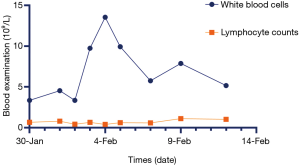 Immediate admission to the isolation ward and supplemental oxygen via a mask [high-flow cannula oxygen therapy (HFNC) (50% concentration, 40 L/min)] were conducted. Aerosol inhalation of interferon α-2b (5 million units twice a day), lopinavir plus ritonavir (500 mg twice a day), and oseltamivir (75 mg twice a day orally) was given for antiviral therapy; moxifloxacin (0.4 g once a day, intravenous injection) for secondary infection prevention. On the second day after admission, the patient was attended by a skilled TCM practitioner for the first time, and he assessed the tongue diagnosis (Figure 3, Table 1). He received TCM decoction (Gegeng with Xiaocaihu, daily). On February 01, 2020 (day 10 of illness), the disease had progressed. The patient developed severe dyspnea and was transferred to the ICU. Methylprednisolone (40 mg twice a day, intravenous injection) was administered to attenuate lung inflammation considering the severe shortness of breath and hypoxemia. Laboratory test results are listed in Figure 4. After receiving medication, his body temperature reduced from 39.0 to 36.4 °C. However, his cough, dyspnea, and fatigue did not improve. A chest CT scan showed progressive infiltrate and diffuse gridding shadows in both lungs (Figure 2B). He had received non-invasive ventilator support in the ICU; therefore, he received HFNC (60% concentration, 50 L/min). At that time, the patient was attended by a skilled TCM practitioner for the second time (Figure 3, Table 1), and he received another decoction (Chaihu + Sanren, daily). On the 12th day of onset, the patient showed symptomatic improvement with oxygen saturation above 95%. The patient was attended by a skilled TCM practitioner for the third time (Figure 3, Table 1), and he received the third decoction (Chaihu + Sanren, daily). On the 14th day of onset, his hypoxemia and shortness of breath improved. The patient was attended by a skilled TCM practitioner for the fourth time (Figure 3, Table 1), and he received another decoction (Xiaochaihu + Maxingshigan). A chest CT scan showed that the left lower lung lesions had increased, enlarged, and combined, and the right upper and lower lung lesions were slightly absorbed (Figure 2C). The oxygenation index rose from 195 to 325 on February 1, 2020 (Figure 5). On day 16 of illness, the symptom of dyspnea continued to improve (Figure 5). The patient was transferred out of the ICU. The patient stopped using lopinavir and ritonavir, and he received antiviral therapy with abidol and strengthened albumin infusion to correct the low protein level in blood. The patient was attended by a skilled TCM practitioner for the fifth time (Figure 3, Table 1), and he received another decoction (XiaoChaiHu + Maxingshigan + Xiaoxianxiong). On days 18, 20, and 22 of illness, the patient was attended by a skilled TCM practitioner three times (Figure 3, Table 1), and he received decoction. His symptom of dyspnea continued to improve. A chest CT scan showed that the bilateral lung lesions were absorbed more than before (Figure 2D) on February 10, 2020. Finally, the patient was cured and discharged from the hospital on February 13, 2020.