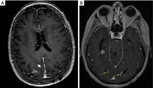 - Nguyen TK, Sahgal A, Detsky J, et al. Predictors of leptomeningeal disease following hypofractionated stereotactic radiotherapy for intact and resected brain metastases. Neuro Oncol 2020;22:84-93. [Crossref] [PubMed]