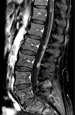 Patients may present with focal or diffuse disease on contrast-enhanced MR imaging of the brain and/or spine. There are variations in the radiographic appearance of LMD including linear/curvilinear enhancement, cranial nerve/nerve root enhancement, or nodular enhancement (27). Intracranial LMD tends to present along the cerebral convexities, cerebellar folia, basal cisterns and ventricular ependyma (Figure 1). Within the spine, all levels of the spinal cord are at risk, however LMD is commonly observed as enhancement and/or nodularity in the cauda equina (Figure 2).