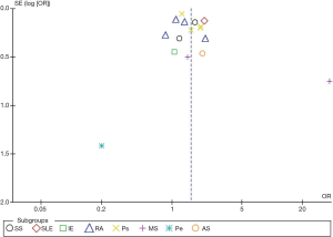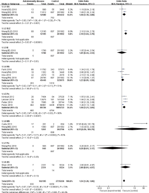 The present study centered on several common autoimmune diseases with a: systemic lupus erythematosus, rheumatoid arthritis, psoriasis, multiple sclerosis, ulcerative colitis, Crohn’s disease, ankylosing spondylitis, pemphigus, and Sjogren’s syndrome. Ten cohort and case control studies from 2004 to the present (8-17) were summarized, 16 groups of comparative data were included, and a meta-analysis was performed. We present the following article in accordance with the PRISMA reporting checklist (available at http://dx.doi.org/10.21037/apm-20-2293).