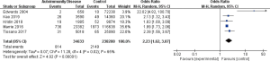 In our literature search, we also discovered some cross-sectional studies reporting on the comorbidity of bipolar disorder in patients with autoimmune disease, and so we carried out another meta-analysis based on these studies (18-22). Among the five included studies, one was related to systemic lupus erythematosus (18), one was related to inflammatory enteritis (Crohn’s disease and ulcerative colitis) (19), two were related to multiple sclerosis (20,21), and one was related to pemphigus (22). A total of 34,633 patients with autoimmune diseases and 238,200 controls were included. The results of the meta-analysis demonstrated that the prevalence of bipolar disorder in patients with autoimmune disease was considerably higher than compared to the control group (MD =2.23, 95% CI: 1.62–3.07, P<0.00001, I2=65%) (Figure 4), which further validates the previous results.