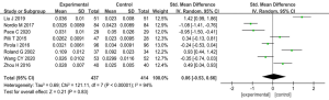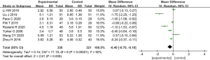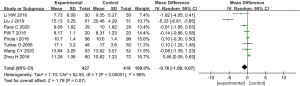 From the 17 included articles, 14 mentioned changes in FT4 levels (8,9,11-15,17-23). Meta-analysis could be performed on 8 articles (11-15,17,20,22). There were 845 subjects, including 427 cases in the experimental group and 418 cases in the placebo group. Heterogeneity was observed between the experimental group and the control group (I2=89%, P<0.00001), therefore the REM was applied. A statistical difference was detected in FT4 levels between the two groups (MD =−0.76; 95% CI: −1.58–−0.07; Z=1.79; P=0.07), as shown in Figure 6. Such results suggested that selenium combined with antithyroid drugs significantly reduced the serum FT4 levels in AITD patients.