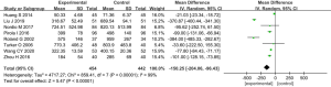 Among the 17 included studies, 14 mentioned changes in the TPOAb levels (9-24). Meta-analysis could be performed on 8 articles (11,13-16,21,22,24), involving a total of 896 cases, of which 454 were in the experimental group and 442 were in the control group. The statistics analysis showed heterogeneity between the groups (I2=99%, P<0.00001), and the REM was applied. As illustrated in Figure 7, the changes in TPOAb levels were significantly different between patients in the experimental group and patients in the control group (MD =−150.25; 95% CI: −204.06–−96.43; Z=5.47; P<0.00001). This suggested that selenium combined with antithyroid drugs significantly reduced serum TPOAb levels in AITD patients.