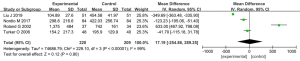 Among the 17 included publications, 9 mentioned the changes in TPOAb levels (9,13,16-18,20-23). Meta-analysis was performed on 4 articles (13,16,21,22) involving a total of 429 cases, including 220 and 209 cases in the experimental group and the control group, respectively. There was no statistical difference in the serum levels of TGAb in patients in the two groups (MD =−17.19; 95% CI: −254.86–289.25; Z=0.12; P=0.90) (Figure 8).