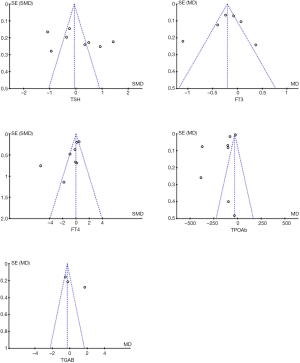 Review Manager 5.3 software was used to study the analysis index based on the effect of selenium combined with antithyroid drugs in the treatment of AITD. The data regarding TSH, FT3, TPOAb, and TGAb levels were relatively scattered, and some literature data fell outside the funnel chart (Figure 9). In contrast, data regarding FT4 levels were relatively concentrated with fewer data outside the funnel chart (Figure 9), indicating that the publication bias of the included literature was low.