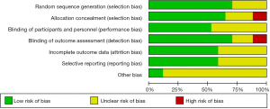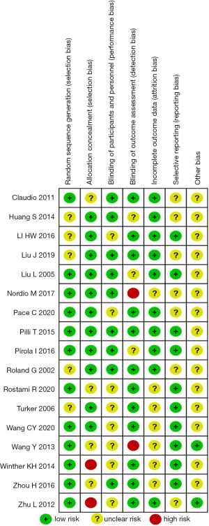 The included research literature was assessed for risk of bias according to the standards in the Cochrane 5.0.2 version of the systematic review manual. The 17 selected articles all reported random grouping. Of these, 5 studies only mentioned that patients were randomly grouped but failed to provide details on which random method was used, and therefore, they were judged as “unclear risk”. A total of 2 articles were determined to have risk of allocation concealment, and 4 articles had undetermined risk of allocation concealment. It was difficult to assess the risk for 8 articles as no blind test information was provided. A total of 2 articles were “high risk” due to the terms of the blind assessment and 3 articles were assessed as “unclear risk” due to a lack of blind test information. A total of 7 publications were judged as “unclear risk” due to unavailable selective report or incomplete data, 15 articles were determined as “unclear risk” as it was difficult to assess if there was any other bias affecting the results. The detailed results of this bias analysis are shown in Figures 2 and 3.