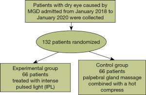 Intense pulsed light (IPL) was first applied in dermatology and has a good effect in the treatment of skin vasodilation, cavernous hemangioma, and other diseases. Recently, some scholars have proposed that the application of IPL can improve the stability of the tear film and improve the clinical symptoms of patients (6). However, there are few reports on the short- and long-term efficacy and safety of IPL in the treatment of MGD dry eye, and there are few randomized controlled trials of IPL in the treatment of MGD dry eye (7). So, this study sought to compare the effects of IPL treatment and those of the traditional treatment in terms of short- and long-term efficacy, clinical-symptom relief, and the incidence of adverse reactions during treatment in patients with MGD dry eye to provide a scientific theoretical basis for the clinical application and promotion of IPL in the treatment of MGD. We present the following article in accordance with the CONSORT reporting checklist (available at https://dx.doi.org/10.21037/apm-21-1303).