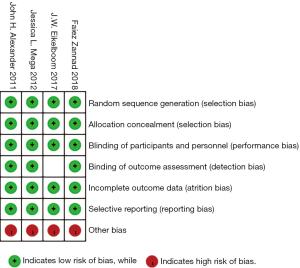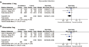 Participants in the APPRAISE-2 and COMMANDER HF trials were randomly divided into the Xa inhibitor and control group, but the Xa inhibitor groups in the ATLAS ACS 2-TIMI 51 and COMPASS trials comprised two different treatment regimens. We used groups with the same dose of Xa inhibitor as a parallel comparison and compared them separately with the control group. The APPRAISE-2 and ATLAS ACS 2-TIMI 51 trials enrolled patients with ACS, but no such patients were included for the COMPASS and COMMANDER HF trials. Therefore, we performed a subgroup analysis for patients with ACS.