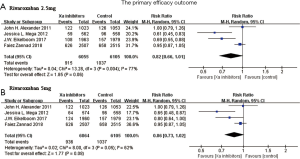 Except for the COMMANDER HF trial, which used the composite endpoint of death from any cause, MI, or stroke as the primary efficacy outcome, the other three trials defined the composite endpoint as death from CV events, MI, or stroke. (In the APPRAISE-2 trial, it was an ischemic stroke, and intracranial bleeding accounted for 0.3% and 0.1% in the apixaban and placebo group, respectively). CV death accounted for about 84.3% (929/1,102) of deaths from any cause in the COMMANDER HF trial. There was no significant difference between the Xa inhibitor and control group regarding the primary efficacy outcome (rivaroxaban 2.5 mg group: RR 0.82, 95% CI: 0.66–1.01, P=0.06, I2=77%, P for heterogeneity 0.004, Figure 3A; rivaroxaban 5 mg group: RR 0.86, 95% CI: 0.73–1.02, P=0.08, I2=62%, P for heterogeneity 0.05, Figure 3B).