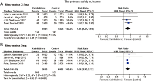 The primary safety outcome was defined as major bleeding according to the TIMI criteria in the APPRAISE-2 and ATLAS ACS 2-TIMI 51 trials. Data of major bleeding according to the ISTH criteria was reported in the COMPASS and COMMANDER HF trials. The risk of the primary safety outcome was significantly increased among patients receiving Xa inhibitors when compared with the control group (rivaroxaban 2.5 mg group: RR 1.55, 95% CI: 1.21–1.98, P=0.0006, I2=0%, P for heterogeneity 0.66, Figure 4A; rivaroxaban 5 mg group: RR 1.66, 95% CI: 1.30–2.12, P<0.0001, I2=0%, P for heterogeneity 0.97, Figure 4B).