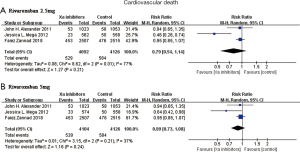 It was also found that there was apparent heterogeneity concerning comparisons of the CV death rates involving the rivaroxaban 2.5 mg groups. When excluding the ATLAS ACS 2-TIMI 51 trial, heterogeneity decreased markedly (I2=0%, P for heterogeneity 0.94). However, there was still no significant difference between groups (RR 0.95, 95% CI: 0.85–1.06, P=0.40).