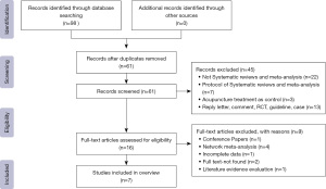 According to the search strategy, we searched eight databases, and a total of 98 studies were selected. Thirty-seven duplicates were removed by EndNote (version X9, Clarivate Analytics) reference management software. Forty-five studies were excluded after title/abstract screening. Eventually, seven SR/MAs were included in the present overview after full-texts inspection (43-49). The entire screening and process of selection is depicted in Figure 1.