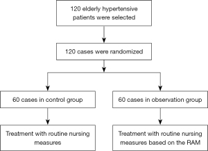 Roy adaptation model was first proposed by Callista Roy who believes that humans are a whole adaptive system and life is a process of continuous adaptation to various stimuli of internal and external environment. The purpose of nursing is to promote people to constantly adapt to the changes of the environment and maintain human's physical, psychological and social integrity for improving the fitness level of the nation’s population. Based on the concept of holism, the RAM discusses the overall adaptation process, adaptation mode, and adaptation mechanism of humans as a system with psychological, physiological, and social adaptation to various internal and external environmental stimuli. To improve the adaptive response of patients, it is necessary to properly intervene in this process and the RAM can guide medical staff to judge and evaluate the stimulus that leads to a patients adaptation problems, so as to implement comprehensive and targeted nursing interventions, reduce or avoid ineffective responses, expand the scope of the adaptive response, and improve the patient’s health level (8). This study aims to discuss the effects of the RAM applied to hypertension nursing on the self-management behavior of elderly patients, their medication compliance, quality of life, and blood pressure control effect, hoping to provide a reference for clinical work. We present the following article in accordance with the CONSORT reporting checklist (available at https://dx.doi.org/10.21037/apm-21-2803).