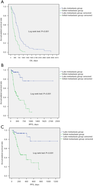 Kaplan-Meier curves showed that the participants in the late-metastasis group had longer OS, IPFS, and PFS than those in the initial-metastasis group (all P<0.001, Figure 1).
