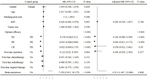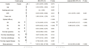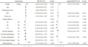 The analysis of factors related to OS in the patients with pulmonary adenocarcinoma is shown in Figure 2. Univariate analysis showed that gender, KPS, tumor size, optimal efficacy of first-line treatment, involvement of surgery in the first-line treatment, involvement of radiotherapy in the first-line treatment, and brain metastasis at initial visit were all significant for OS. When analyzed by multivariate analysis, gender, KPS, optimal efficacy of first-line treatment, involvement of radiotherapy in the first-line treatment, and brain metastasis at initial visit remained significant factors related to OS.