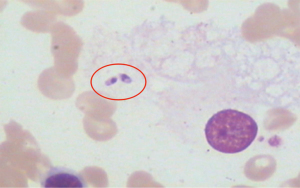 Twenty-seven patients (23 men and 4 women, aged from 9 to 59 years) were included in this study (Table 1). Twenty-two of the patients were diagnosed through the identification of Leishmania amastigotes in bone marrow smear (Figure 1). One patient was diagnosed by the identification of the parasite in a bone marrow biopsy instead of a smear. Leishmania donovani was not found in either the bone marrow smears or the biopsies of the other 3 patients; however, high titers of anti-leishmania antibodies were detected in these patients, and the effective treatment response to VL confirmed the diagnosis of VL in all three of them.