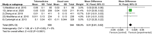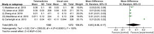 A total of six studies were included for the BMI (34) synthesis (Figure 5). There was evident heterogeneity (I2>50%) and no statistical difference between the intervention and control groups (P>0.05), indicating that the use of telemedicine had no significant effect on patients’ body mass index.