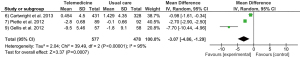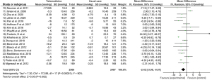 The extracted data were analyzed by the Review Manager 5.0 software provided by Cochrane Collaboration Network. The dichotomous variables were presented by odds ratio (OR) or risk difference (RD). Continuous variables were expressed by mean difference (MD). Both data were presented using a 95% confidence interval (CI). I2 value was used to test the heterogeneity between different studies. When the heterogeneity was significant (I2≥50%), random-effects model was used for data analysis. On the contrary (I2<50%), a fixed-effects model was used for data analysis. The difference was statistically significant when P<0.05.