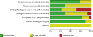 Since all included studies were RCTs, the risk-of-bias was assessed based on the Jadad scale (6) (a 5-point scale evaluating the quality of RCTs) and the Cochrane risk-of-bias tool (supported by RevMan software).