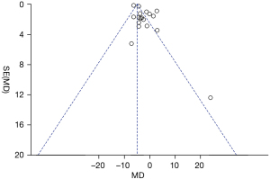 We used the analysis for systolic blood pressure for the assessment of reporting bias since it included the most of the studies. We had a heterogenesis of I2=90%. An assessment of heterogeneity is considered an essential part of meta-analysis. As shown in the funnel plot of the effect measures and standard errors constructed by RevMan software (Figure 11), half of the studies fell outside the pseudo 95% confidence interval. By visual confirmation, the scattering pattern did not reflect a symmetrical inverted triangle, indicating that the included studies had significant heterogeneity. To confirm this observation, we conducted Begg and Egger tests using Stata software, the results of which are shown in Tables 3,4.