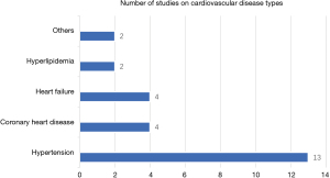 Our meta-analysis combined the outcomes of 7,602 cardiovascular patients from 21 individual studies. The distribution of the specific types of CVD is shown in Figure 2, with one study including both hypertension and hyperlipidemia.