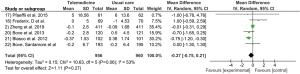 A total of 21 studies were included in the quantitative meta-analysis of SBP (Figure 3). We used a random-effects model since there was significant heterogeneity (I2>50) with the difference in means (baseline, and at study completion) as the effect measure. The results showed a statistical difference (P<0.05) between the intervention and control groups with a favorable inclination toward the telemedicine-enhanced health care program over usual care.